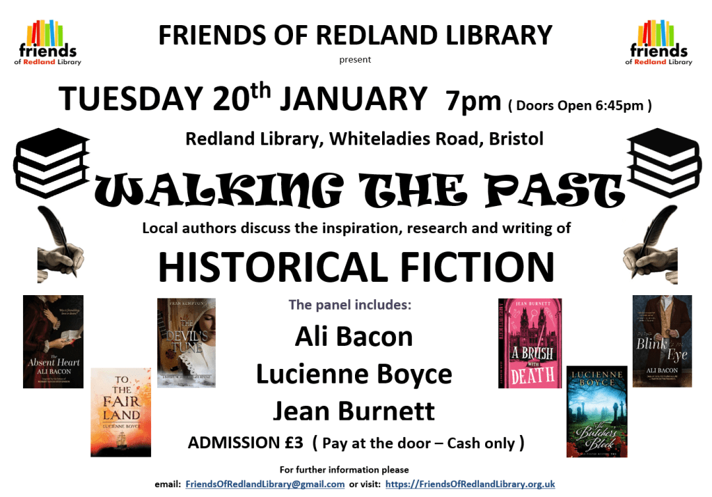 I’m delighted to have been invited by the Friends of Redland Library, a very active community group, to talk with fellow authors about writing historical fiction.
